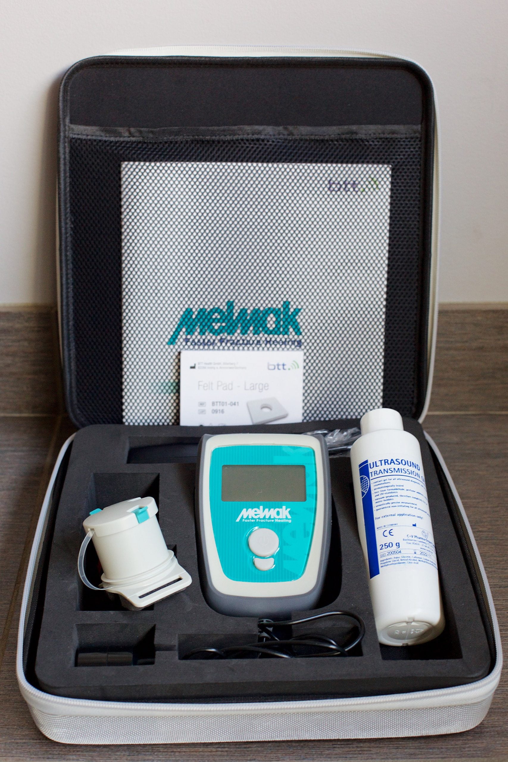 The Melmak bone growth stimulator is a portable ultrasound machine that enhances the bones natural healing process. Low intensity pulsed ultrasound (LIPUS) is a non-invasive ultrasound technology that is administered directly against the skin sending a mechanical force through the tissue to stimulate the bone to heal. This process activates cell reproduction and protein expression and enhances cellular behavior at the fracture site.